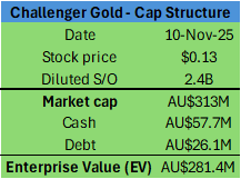 Despite being on the cusp of production from January 2026, Challenger today trades at a meagre 2.6x NTM EV/EBITDA, assuming US$4000/oz gold.
